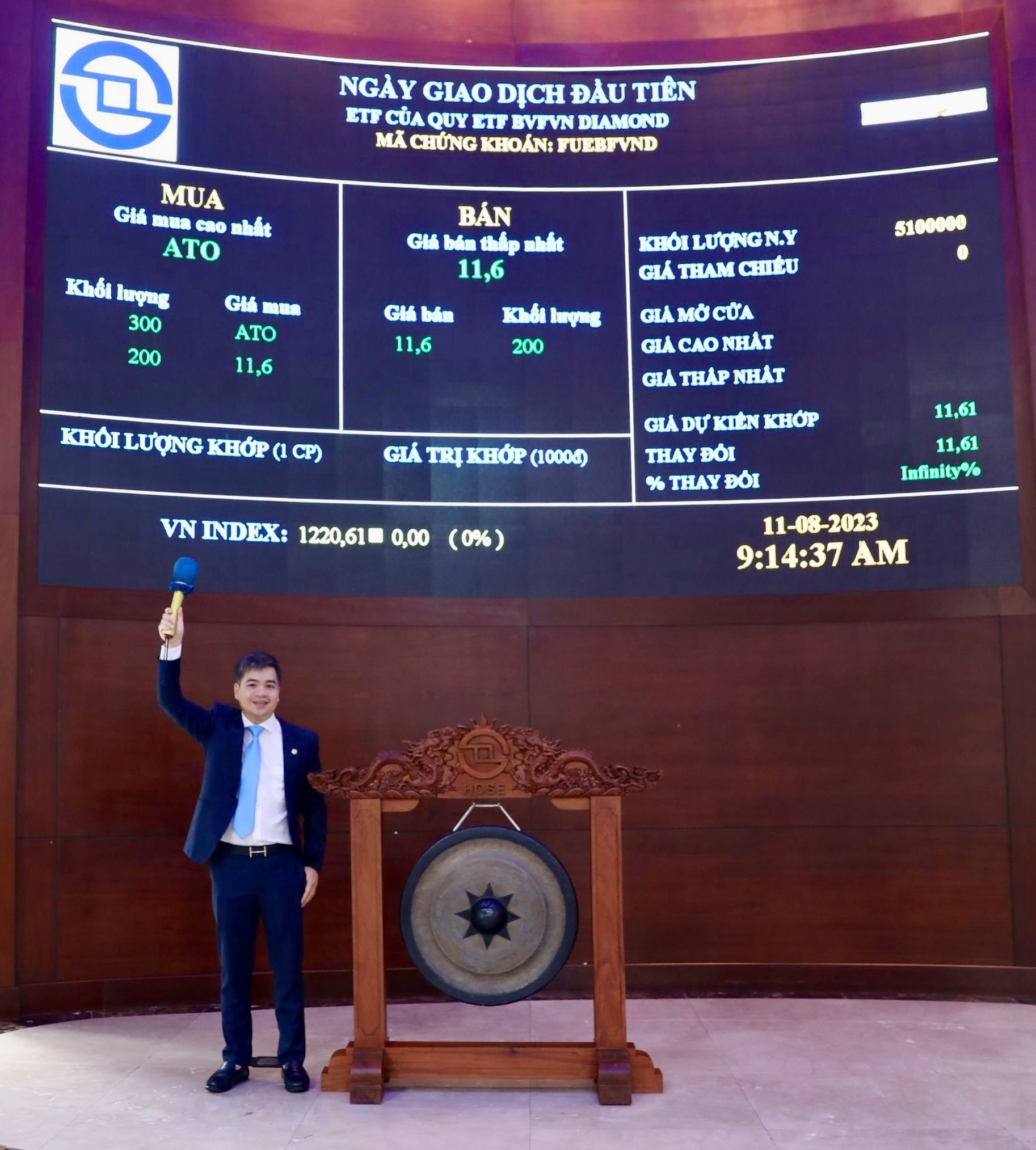 Tại buổi lễ trao quyết định niêm yết, đại diện lãnh đạo HOSE đã chúc mừng phiên giao dịch đầu tiên của chứng chỉ quỹ FUEBFVND. Với vai trò là đơn vị vận hành thị trường, HOSE luôn đồng hành, hỗ trợ các doanh nghiệp trong việc thực hiện nghĩa vụ của các công ty niêm yết, đặc biệt là nghĩa vụ công bố thông tin, cập nhật các quy định, chính sách liên quan đến thị trường chứng khoán. Kết thúc buổi lễ, đại diện Công ty Quản lý Quỹ Bảo Việt đã đánh cồng chính thức niêm yết chứng chỉ quỹ ETF BVFVN DIAMOND trên sàn HOSE.